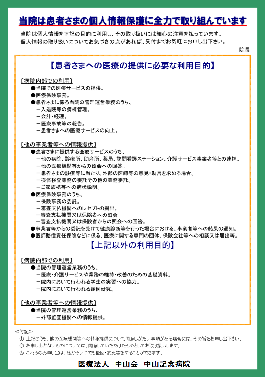 | 平成03年 04月01日 | 法人名称及び病院名称 | 法人名称を【医療法人社団 中山会】に、 病院名称を【中山記念病院】に変更 |